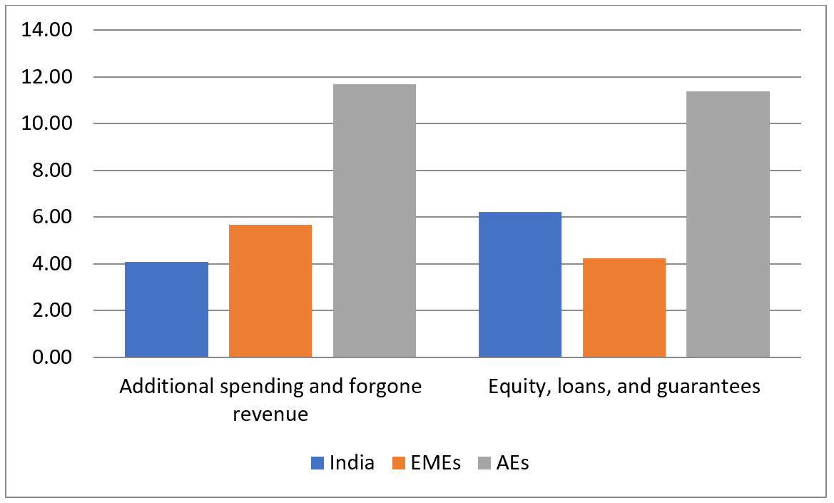Two, the government’s efforts to mitigate the crisis were measly compared to most large economies. As per IMF data released in October 2021, fiscal support in India was lower than the average for the advanced economies (AEs), as well as for emerging market economies (EMEs) (Figure 2). For example, additional spending or revenue foregone in India since January 2020 was 4% of GDP, whereas it was close to 12% of GDP in advanced economies. India's response was greater in offering credit and loan guarantees (contingency funds), the utilisation of which was modest due to lack of demand. Moreover, that additional revenue provided for health during the pandemic was as meagre as 0.5% of GDP (IMF, 2021).