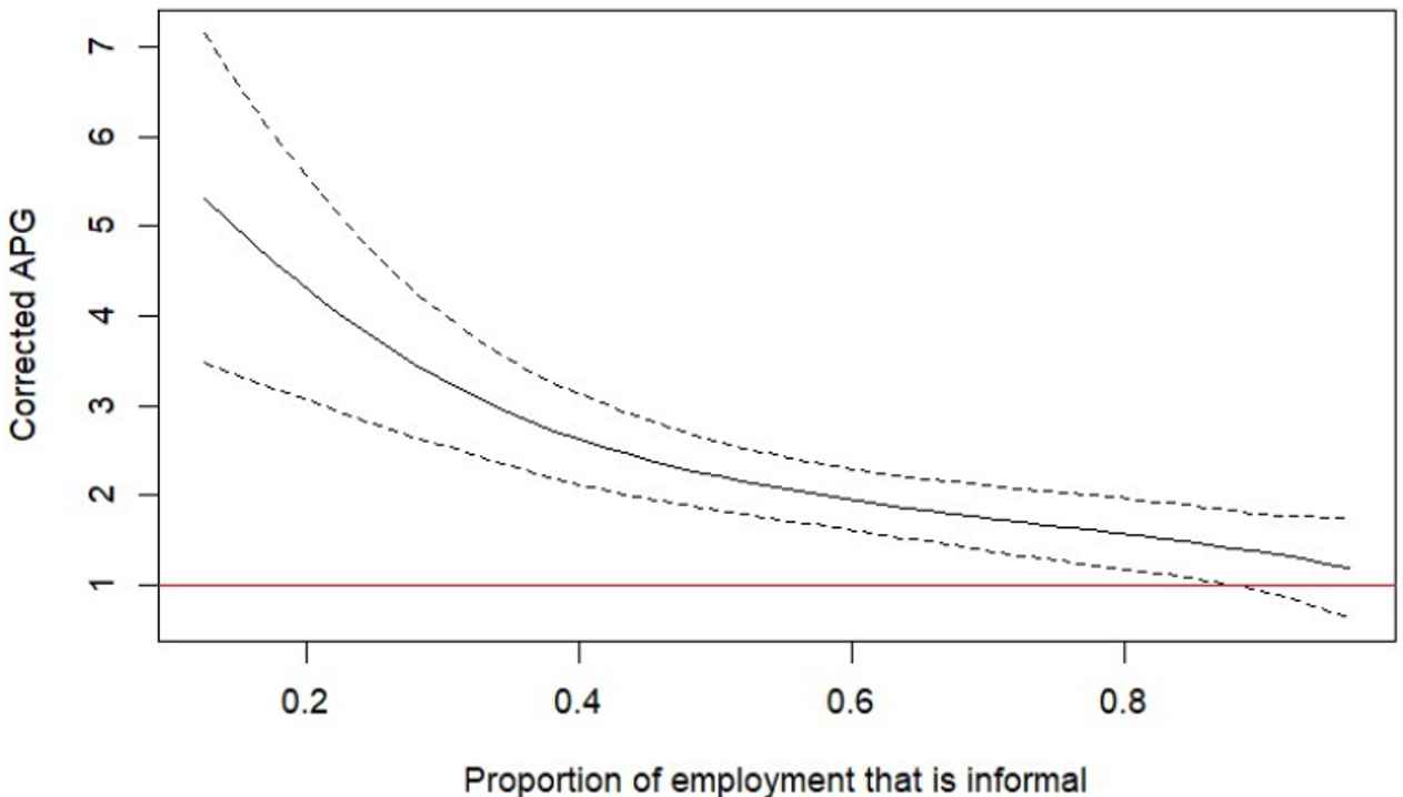 The estimated function is downward sloping – the APG declines as the proportion of informal employment increases. The null hypothesis of perfect mobility between agriculture and the non-farm sectors is rejected whenever the percentage of informal employment is less than 83%. On the other hand, the hypothesis is not rejected for sectors where the proportion of employment that is informal is greater than 83%. Depending on the year, these sub-sectors account for 40-50% of all non-farm employment.