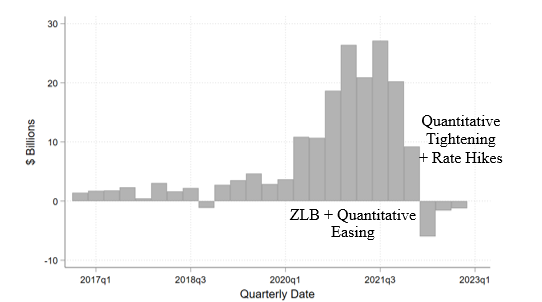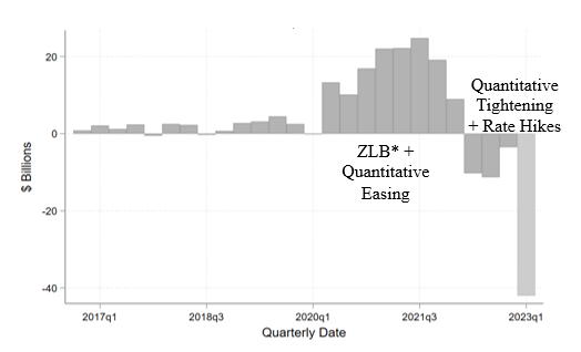 Notes: (i) Graph plots the quarterly change in total deposits of Silicon Valley Bank (SVB Financial Group). (ii) The estimate for 2023Q1 is based on Silicon Valley Bank’s mid-quarter update. (iii) ZLB or Zero Lower Bound refers to a situation when interest rates are zero or near-zero, limiting a central bank’s options to stimulate growth by further cutting rates.