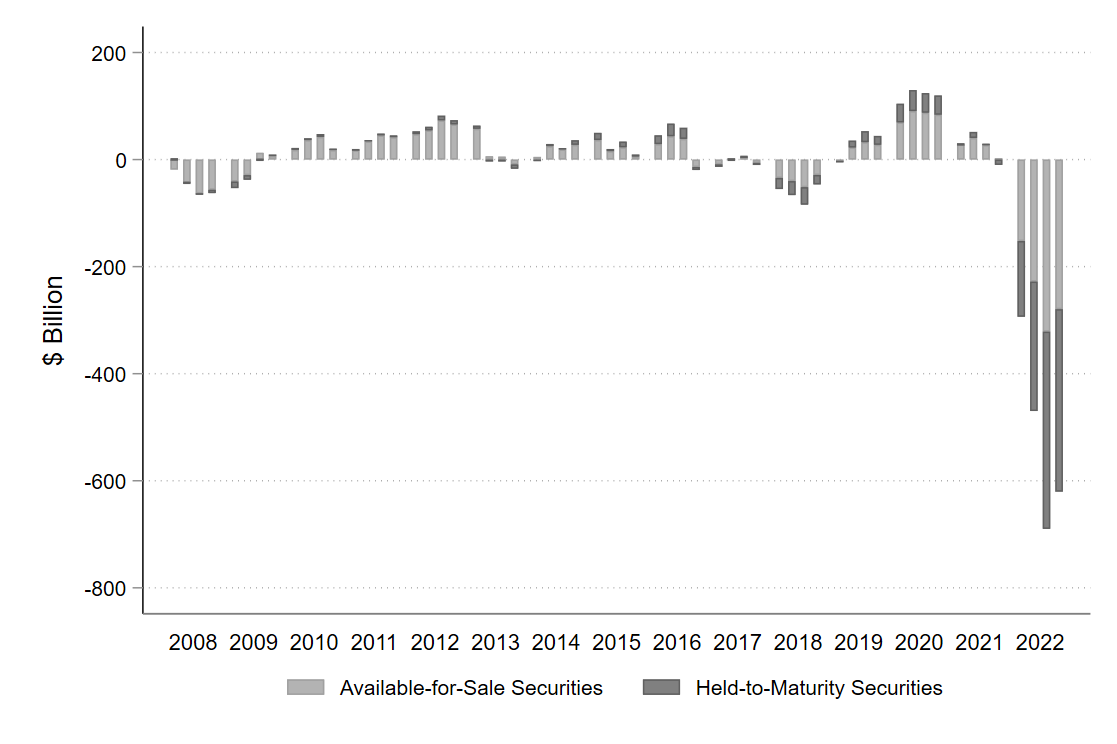 SVB’s balance sheet mirrored this aggregate phenomenon (Figure 2). Before QE, deposit inflows at SVB in the third quarter of 2019 were less than $5 billion, whereas they averaged $14 billion per quarter during QE. However, once QE ended and switched quickly to quantitative tightening, the flows reversed. SVB started seeing uninsured deposit outflows – no doubt some of it coincident with the downturn in the tech sector, with the bank’s stressed clients starting to draw down deposits.