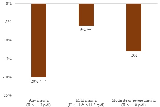 Our findings show statistically significant impacts on haemoglobin and anaemia among school children. The DFS supply for mid-day meal preparation increases haemoglobin levels by 1.2% and reduces prevalence of any form of anaemia by 20% among the treated children (see Figure 1).