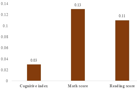 Even though the DFS treatment decreased the prevalence of anaemia by 20%, on average the one-year intervention of 0.86 mg of iron per gram of salt was not (yet) sufficient to improve the cognitive ability of second-grade students. The cognitive index increased by 0.03 standard deviations1 due to the treatment but the results are statistically insignificant (see Figure 2). The math and reading scores increased by 0.13 and 0.11 standard deviation, respectively, but these are not statistically significant.