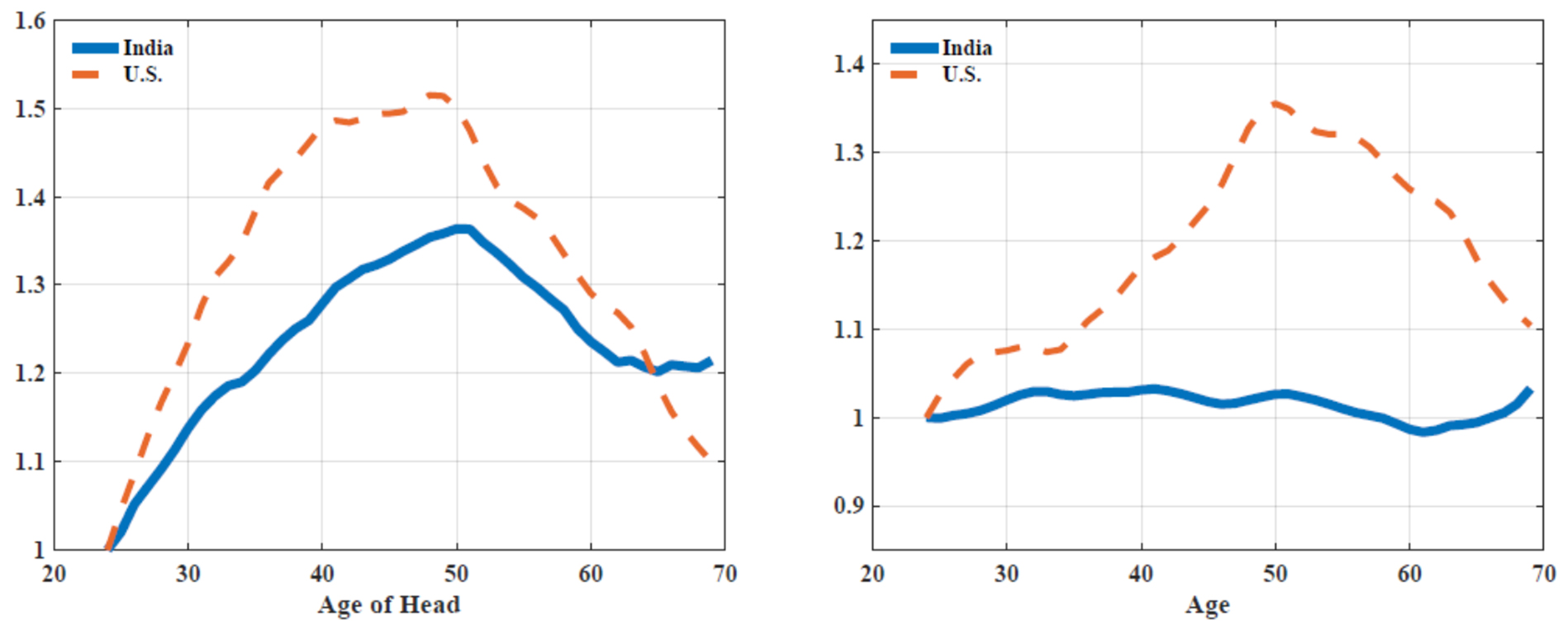 To compare Indian households to that of the US, we use the well-known Panel Study of Income Dynamics data for the latter. As with established research, we restrict our attention to consumer non-durable expenditures since durable goods and large physical-asset purchases behave differently than non-durables in terms of their flow value of consumption relative to the purchase4. Furthermore, CPHS data does not record the actual expenditures on large asset purchases such as houses and cars. Figure 1 (left panel) plots household non-durable consumption expenditures for both countries over the lifetime of the head of the household, relative to consumption expenditures at the start of their earnings cycle (age 25). As seen in the figure, by the time the US household head reaches the age of 50, their consumption expenditures are 50% more than their expenditures at 25. Indian households also reach their peak around the same age, but at a much lower level of 35%.