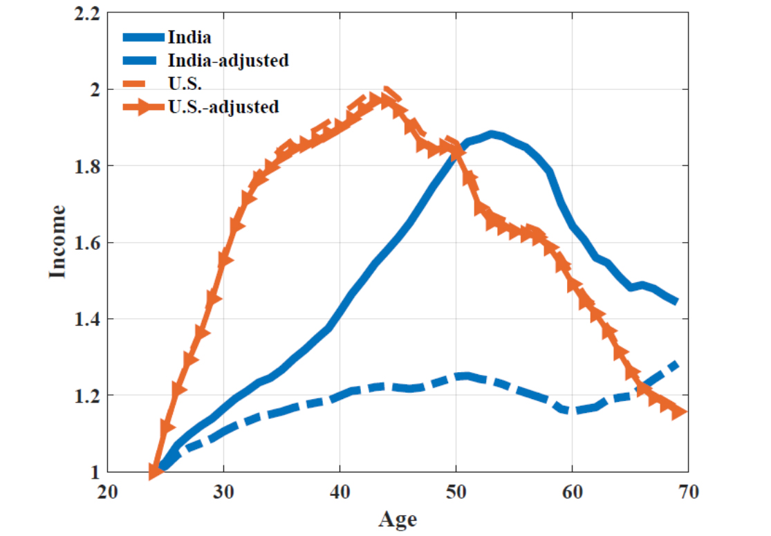 In Figure 2, we depict the evolution of household income. While total household income in India peaks at a slightly later age, its growth is only marginally lower than the peak value of American households (100% versus 90%6. In other words, household income increases faster than consumption seen in Figure 1 (left panel). Figure 2 also plots the income adjusted for the number of earning members in the household. This provides an interesting additional detail – most of the household income growth that we see for India appears to be driven by changes in the number of earning members and not the growth in individual incomes. The main conclusion we draw from Figures 1 and 2, is that low growth in household income does not explain the low growth in consumption.