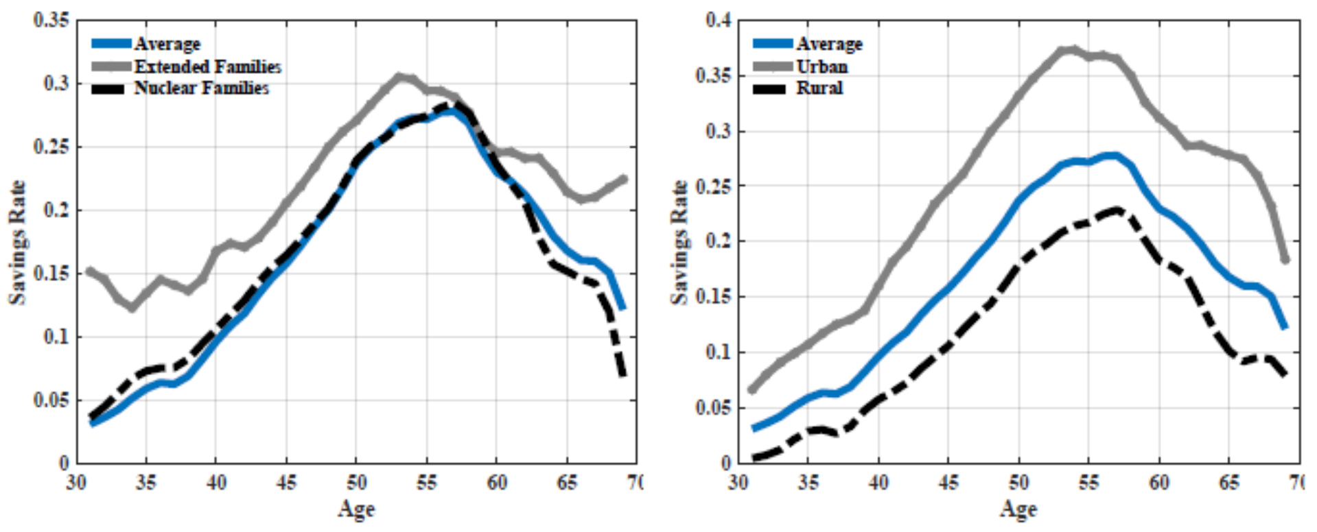 The canonical predictions of lifecycle models going back to Modigliani’s Nobel prize-winning work are well-known. Households are predicted to smooth consumption over their lifetimes. With incomes beginning at low values, subsequently rising until retirement, and followed usually by a drop (and reliance on pensions), this translates initially into negative savings, which then increases during working life, followed by a drawdown during retirement. However, rich empirical data from high-income countries have not supported the prediction of consumption smoothing. For example, Fernández-Villaverde and Krueger (2007) in their influential study note that even after controlling for family composition, consumption continues to rise with income in the US. Researchers have pointed to factors such as the inability to borrow, combined with uncertainty regarding future incomes to explain the data vis-à-vis the predictions of the model. Uncertainty regarding future incomes, makes lending to households at early stages of their careers a risky prospect for financial institutions even in high-income countries. Combined with the fact that individuals themselves cannot predict their future growth in incomes perfectly, this means that consumption expenditures tend to track incomes leading to positive savings. For China, some of the differences are also often attributed to the marriage market and the competitive savings motive (Du and Wei 2013)1.