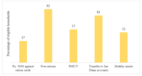 We find that access to PDS during the lockdown was high (about 92%). Access to other schemes varied (Figure 3) and, on average, eligible households had access to at least four out of five schemes.
