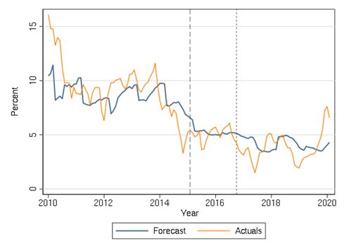 आकृति-1. सीपीआई मुद्रास्फीति में पूर्वानुमान और वास्तविक रुझान