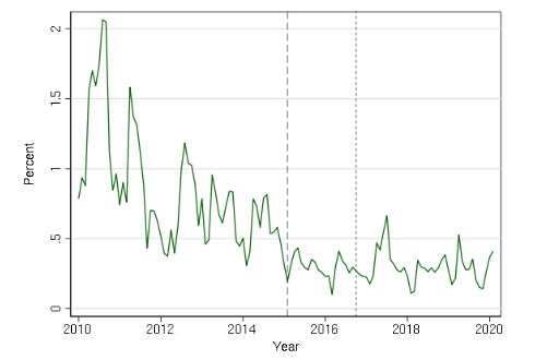 व्यक्तिगत सर्वेक्षण प्रतिभागियों के पूर्वानुमानों का उपयोग करते हुए हम यह अध्ययन करते हैं कि एफआईटी को अपनाए जाने के बाद से पूर्वानुमानकर्ताओं की असहमति कैसे बदल गई है। आकृति-2 में, हमने पूर्वानुमानकर्ताओं के बीच सीपीआई मुद्रास्फीति के वित्तीय वर्ष के पूर्वानुमानों के मानक विचलन यानी स्टैण्डर्ड डिविएशन को दर्शाया है। यदि एफआईटी अध्यादेश विश्वसनीय था तो हम उम्मीद करेंगे कि विशेष रूप से सीपीआई मुद्रास्फीति के संदर्भ में, एक-एक उत्तरदाता के पूर्वानुमान, एक-समान हो जाएं। दूसरे शब्दों में, हम उम्मीद करेंगे कि एफआईटी के बाद की अवधि में पूर्वानुमानों का मानक विचलन कम होगा। हमने पाया कि एफआईटी के बाद की अवधि में सीपीआई मुद्रास्फीति पूर्वानुमानों के मानक विचलन में वास्तव में स्पष्ट गिरावट आई है।