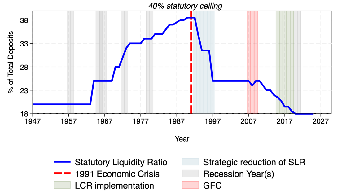 This trade-off between stability and growth is central to how liquidity regulations influence financial intermediation in emerging markets like India. Yet, despite their widespread adoption, we know relatively little about their broader macroeconomic consequences. In new research, I seek to address this gap by examining the dynamic effects of liquidity requirements in India on key bank and macroeconomic outcomes. Specifically, I focus on the long-standing SLR, leveraging historical variation in the regulation to identify causal effects.2