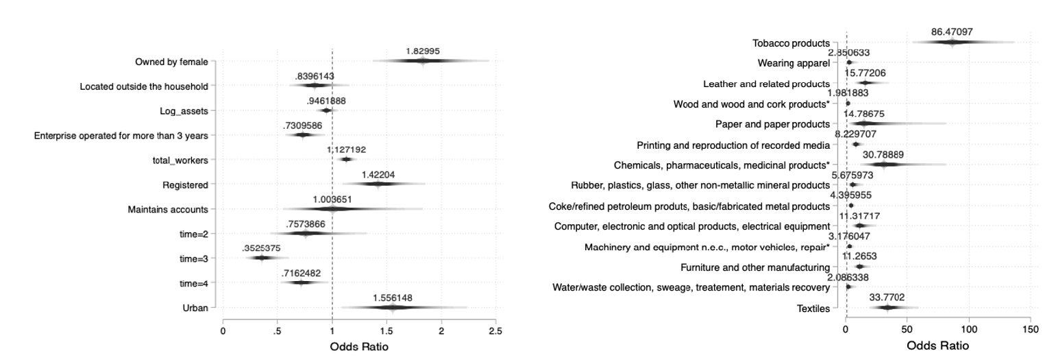 Finally, I investigate what kinds of enterprises enter subcontracting relationships. I estimate this using a ‘maximum likelihood estimation’3, and represent the results using an odds ratio.4 The gender of the enterprise owner, rural/urban location, duration of operation, and industry group are significant factors influencing the likelihood of an enterprise entering subcontracting relations. For example, on average, over the period of analysis, female headed enterprises are 1.8 times more likely to subcontracting relationships relative to non-female headed ones (Figure 6). Moreover, among the major industry units, the incidence of subcontracting is particularly high in tobacco products and textiles.