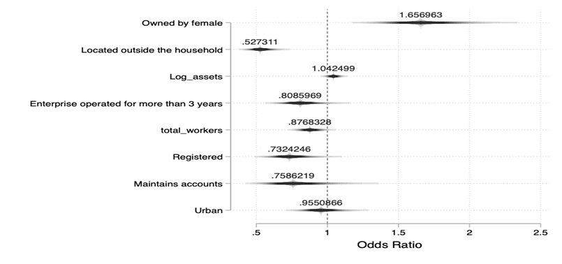 Notes: (i) The figure presents results from logit maximum likelihood estimation, with binary dependent variable model. (ii) The binary dependent variable takes the value 1 if the enterprise is put-out and 0 if it is non-put-out. (iii) Explanatory factors include gender of the enterprise owner, whether the location of the enterprise is within out outside the household, log value of assets owned or hired, whether the age of the enterprise is less or more than three years, total number of workers, registration status, accounts maintenance sector (rural/urban). Additional controls include time points, industry groups, state zones. (iv) Odds ratio reported. Clustered robust standard errors, clustered at state levels.