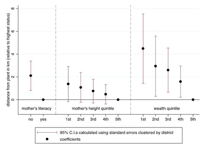 Figure 2 shows that children with illiterate and shorter mothers, and children living in poorer households, on average, live farther away from coal plants when compared to children whose parents are higher in socioeconomic status. This is an interesting pattern that is unique from other parts of the world, where poorer households are more likely to live in places that have lower locational quality and higher air pollution. This also suggests that there are important and complex distributional consequences from coal plant expansions in India.