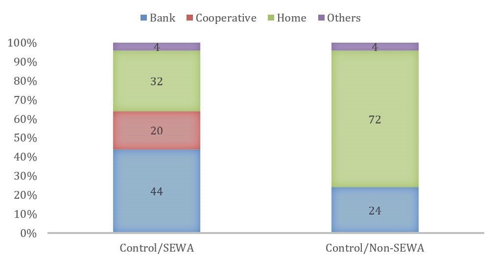 It was found that in non-SEWA villages where no basic income was transferred, women held only 24% of their savings in financial institutions such as banks and cooperatives (figure 1). In comparison, in SEWA villages, 64% of women’s savings were in formal financial institutions.