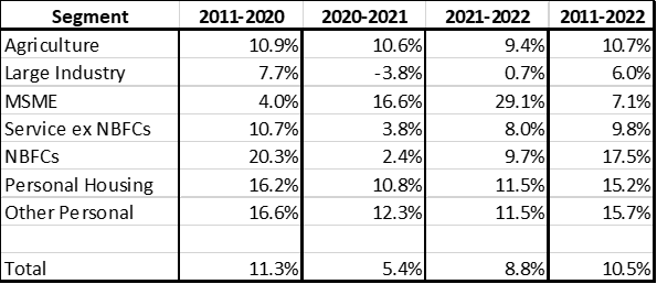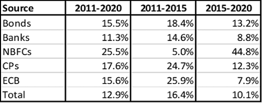 We see that, barring NBFCs, there was a sharp decline in growth in the second half of the decade across all other sources of credit. The overall credit growth declined from 16.4% to 10.1%. The only source of credit that experienced a sharp increase in growth rate was the NBFCs, whose credit growth went up from 5% to close to 45%. In contrast, bank credit growth declined from 14.6% to 8.8%.