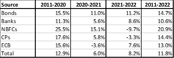 Table 2 shows that during the first year of the pandemic (that is, FY2020-21), credit growth from all sources had slowed down. Bank credit growth had almost halved from 11.3% in the previous decade to 5.6%, although it recovered to 8.6% by FY2021-22. Also drastic was the decline in credit growth from NBFCs, from 25.5% to 15.1% in the first year, followed by a contraction in the next year. Clearly, the pandemic was yet another massive blow to the NBFCs. Bond market credit on the other hand grew at a steady rate of 11% during this period.