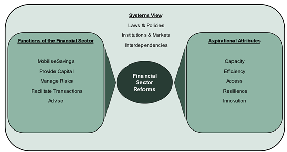 The examples cited above can be better understood using what we call a ‘conceptual map of financial sector reforms’. It looks at three important components of reforms: specific functions of the financial system that the reforms seek to address; aspirational attributes that the reforms aim to develop in the system; and the comprehensive systemic view embedded in the reforms.