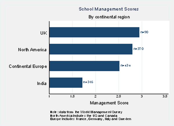 India’s average management quality is found to be the lowest of all the countries we surveyed across all sectors (Lemos and Scur, forthcoming). But why is India’s management quality so much worse than that of countries in Europe and North America?