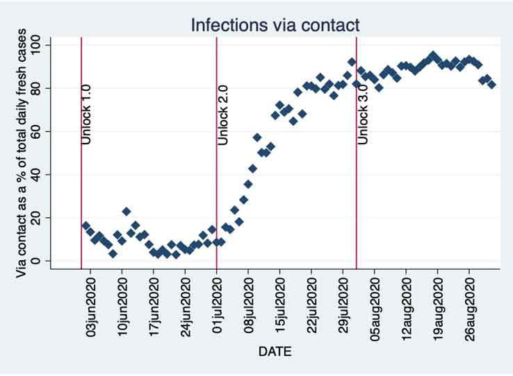 Just looking at the daily total fresh cases is going to hide important details. We will now consider the share of infections via contact (contact infections, hereafter) among the total daily fresh cases. Kerala’s success in restricting the infections to only the primary cases and not allowing it to spread was amply clear in the first phase of the pandemic. The cases came from outside the state and the spread was limited to a great extent. How did the removal of restrictions affect this trend? Figure 2 gives the answer.