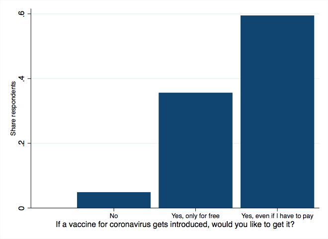 Importantly though, in addition to 5% of the population not willing to get vaccinated, 36% stated that they would only get vaccinated if they did not have to pay for it (Figure 1).