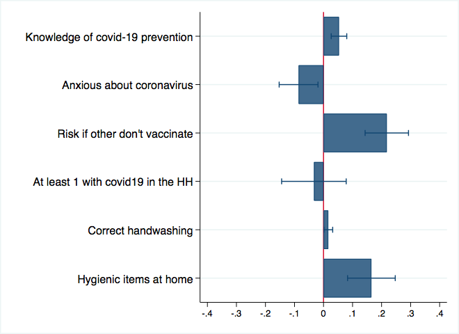 We also find that those more anxious about the virus, are less willing to pay for a vaccine. This could be driven by fear of side effects, a major factor for resistance to vaccination against Covid-19 in advanced economies. Extreme anxiety can also generate a loss in hope on the effectiveness of any vaccination to come.