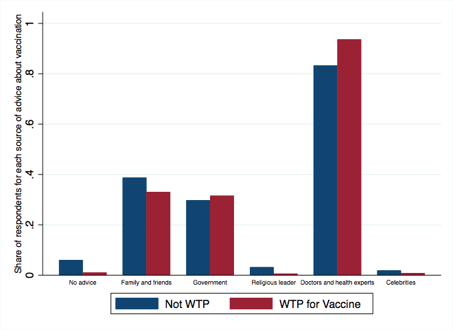 On the contrary, a larger percentage of respondents reporting that they would not look for advice or would get advice from family and friends about the vaccine, are those not willing to pay.