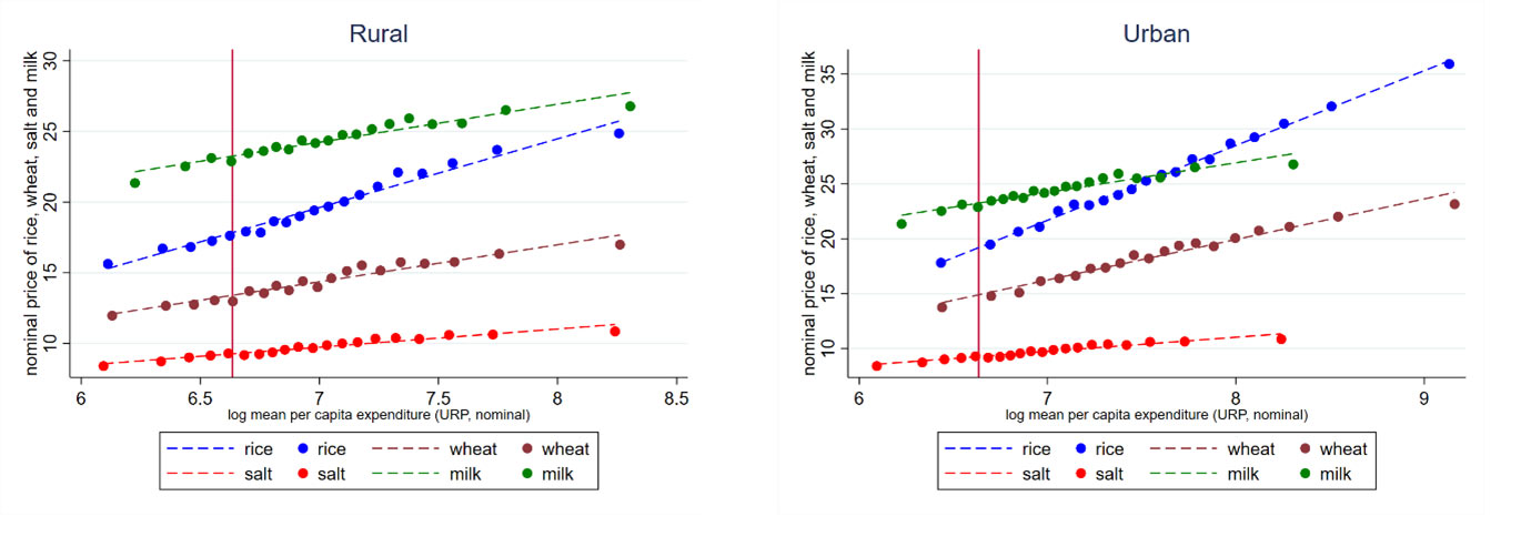 Notes: i) The upward slopes here capture the higher nominal prices paid by households for the same good at different per capita expenditures. These are arguably induced by differences in the quality of staples purchased at different expenditure levels when compared to the slope of salt. ii) Unit prices are calculated as the ratio of household expenditure on items and quantities consumed in the 2011 round of CES. iii) The unit price for rice and wheat depicted in the figure does not include households’ cereal consumption from the Public Distribution System (PDS). iv) The vertical red line is the $1.90 poverty line – poor households are to the left of this line
