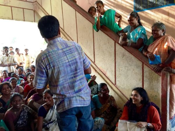 Chakradhar Buddha translates questions from Sudha Narayanan and responses from female MNREGA workers. Photo by Megan Sheahan.