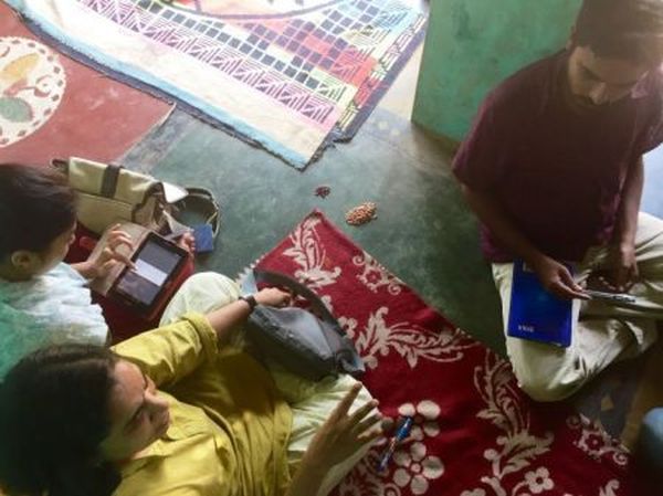 Krushna Ranaware (with tablet), Sudha Narayanan, and Chakradhar Buddha discuss a strategy for interviewing households in Vanabangipadu. Photo by Megan Sheahan.