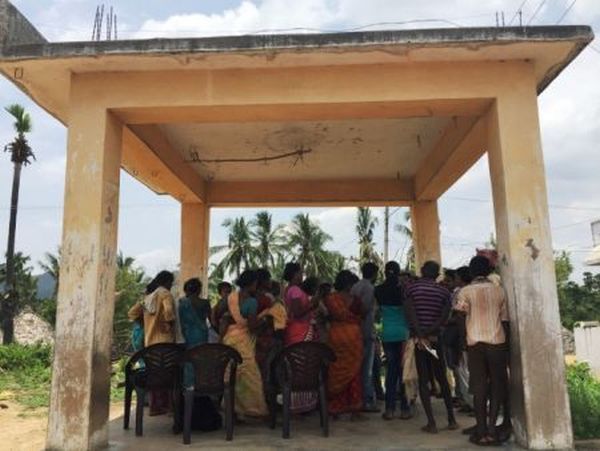 Wage seekers in Nallaregulapalem explain the shortcomings of the biometric MNREGA payment system. Photo by Megan Sheahan.