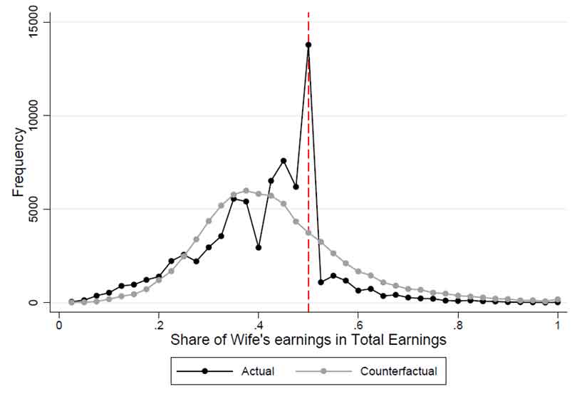 - For couples working in the same industry and occupation, one can expect that the spike at 50% share of income is institutional as they get paid the same wages. I find that even for couples who work in different industries and occupations the discontinuity (although smaller) exists.