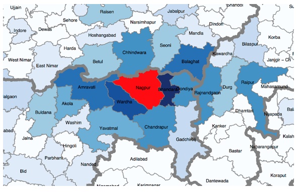 To illustrate the (restrictive) role of state borders on internal migration, consider the district of Nagpur in Maharashtra. Nagpur is geographically located at the centre of India and close to three other states: Andhra Pradesh, Madhya Pradesh, and Chhattisgarh. Figure 1 plots the color-coded distribution of the origin districts of the migrants coming to Nagpur, with darker shades implying higher shares of migrants. The thin lines represent district borders and thick lines are the state borders. The four neighbouring districts in Maharashtra (Bhandara, Wardha, Amravati, and Chandrapur) sent a total of 31% of Nagpur’s immigrants. In contrast, the remaining three neighbouring districts in Madhya Pradesh (Balaghat, Chhindwara, and Seoni) sent a total of only 13%. More migrants came to Nagpur from other districts in Maharashtra that are hundreds of kilometres away than from neighbouring districts in other states.