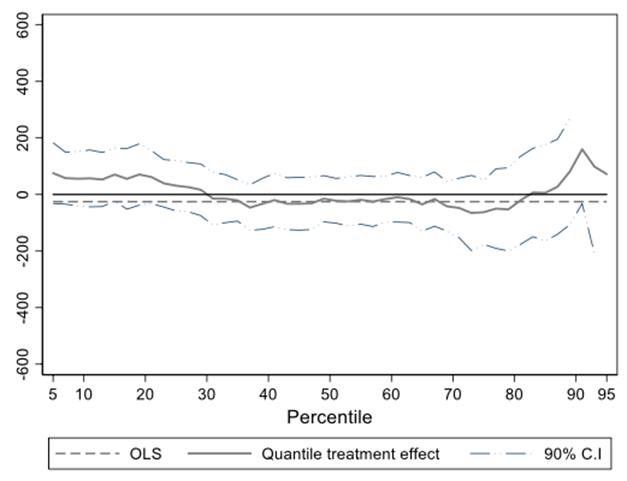 One important implication of a poverty trap is that, even among the ‘gung-ho’ entrepreneurs, the effects of microcredit will not be the same for everyone. Some households may already be out of the poverty trap, while others may be so poor that microcredit is not enough to help them escape. To explore this, we look for impacts of microfinance at different parts of the distribution. For instance, we compare the median (the 50th percentile) household in the treatment vs. control groups. Figures with these distributional comparisons are shown below. They reveal that for those who are not ‘gung-ho’ entrepreneurs, there are essentially no impacts (positive or negative) on profits or consumption anywhere in the distribution. For the ‘gung-ho’ entrepreneurs, the effects on profits are concentrated in the top third of the distribution. Turning to consumption, while we do not detect an impact on average non-durable consumption, we see positive impacts for the 30th to 80th percentiles (see Figure 2).