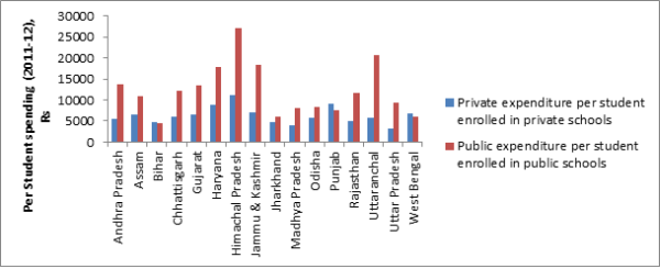 The landscape of elementary education (EE) in India has changed dramatically in the last few years. On the one hand, it has been characterised by a concerted push to build physical infrastructure and human resources for public provision of education, and launch of a variety of schemes to reduce the number of out-of-school children. On the other hand, there is an increasing preference of parents to send their children to private schools. Despite these structural changes, estimates on public and private expenditure on elementary education are not available. We attempt to fill this gap by estimating annual public expenditure per student for those enrolled in government schools, and annual private expenditure per student for those enrolled in private schools, for 16 major states in India for 2011-121 (Dongre, Kapur and Tewary 2014).