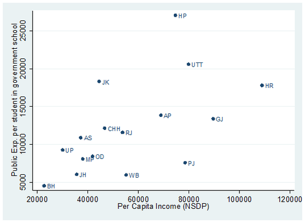 Figure 2. Per capita income and public expenditure on EE per student in government schools, for 16 major states (2011-12)