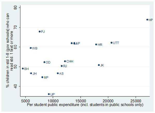Figure 4a. Public expenditure per student enrolled in government schools (2011-12) and learning outcomes in Reading (2011), for 16 major states