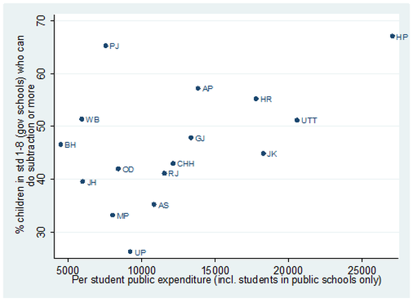 An important question is: is there is an association between public expenditure per student on EE and learning outcomes? Figure 4 shows that on an average, higher the public expenditure per student in a state, the higher is the learning outcome. We define learning outcome as the proportion of students in grade 1-8 in government schools who can read letters, words or more, or recognise numbers 1-9 or more (Annual Status of Education Report (ASER) 2011, 2012).