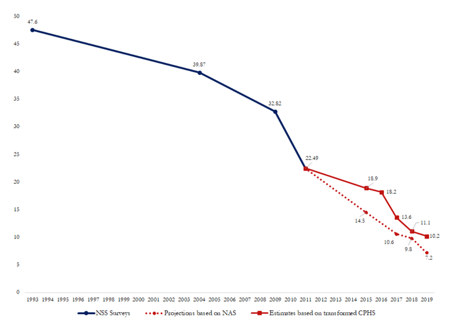 Notes: i) Poverty projections use the World Bank’s poverty line of $1.90 PPP per day. ii) The blue line indicates poverty rates according to data from NSS surveys; the solid red line indicates estimates based on transformed CPHS data, and the dotted red line indicates estimates based on the national accounts system.