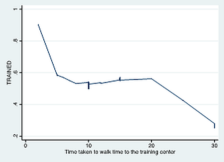 We are able to identify three crucial barriers to programme completion: credit constraints, local access and lack of child-care support. First, while the Satya/ Pratham programme was not the only programme available to these women, only 13% of the women assigned to the control group take up and complete courses offered by other providers. This confirms the importance of credit (and resource) constraints as a significant barrier to programme participation and completion. Second, distance to the training centre captured by the time taken to walk to the training centre is a significant barrier to skill accumulation – Figure 1 depicts the strong negative relationship between distance and programme completion. Indeed the importance of local access and distance was reiterated to us in informal conversations with different stakeholders. Women in India, particularly those belonging to the socio-economic class from where the programme applicants were drawn, typically face a large number of restrictions on mobility. They need permission to use public transport and often need permission to visit family and friends. So while there are similar programs offered by private organisations and the government, these programs are often centralised, implying that participants have to travel long distances to reach the training centres. This increases the cost of programme attendance, which can act as a significant barrier to skill accumulation.