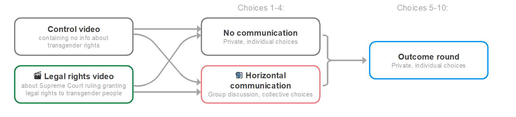Then, to measure the effects of horizontal communication between participants, I randomise whether participants are earlier involved in a discussion with two of their neighbours (see Figure 1). In this discussion, participants are also shown a series of hiring options and asked to make collective choices over which options they prefer. Some of the options include transgender workers, and participants discuss whether they want to hire transgender workers. Crucially, the only communication about transgender people in this discussion comes from the participants themselves, rather than from the discussion facilitator. Moreover, the purpose of the experiment was hidden from participants to avoid response bias: only 8% of respondents guessed that the study was about discrimination, and these respondents do not drive the results.