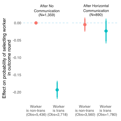 However, horizontal communication between these discriminatory participants substantially reduces discrimination. The effects of the group discussion on discrimination are stark: even when people are making private, individual choices after the discussion has ended, they are 17 percentage points (42%) more likely to select a transgender worker than the control group (who were not involved in a discussion) (Figure 1, right panel). The level implies that there is no significant anti-transgender discrimination, on average, in the discussion arm.