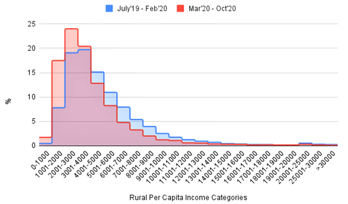 The entire distribution of incomes shifted to the left as all groups experienced a decline in incomes (Figure 1). We arrange households from lowest to highest incomes and group them into clusters of Rs. 1,000 based on their seasonally adjusted average per-capita monthly income in the pre-Covid-19 and the Covid-19 months. We find that the percentage of households that have an average monthly income below Rs. 4,000 per capita (for a typical family of four this is equivalent to Rs. 16,000) in both rural and urban areas increased in the Covid months – from roughly 50% in pre-Covid-19 period to close to 65% during the Covid-19 period in the rural sector – while it declined for all incomes groupings with income higher than Rs. 4,000 per capita per month.