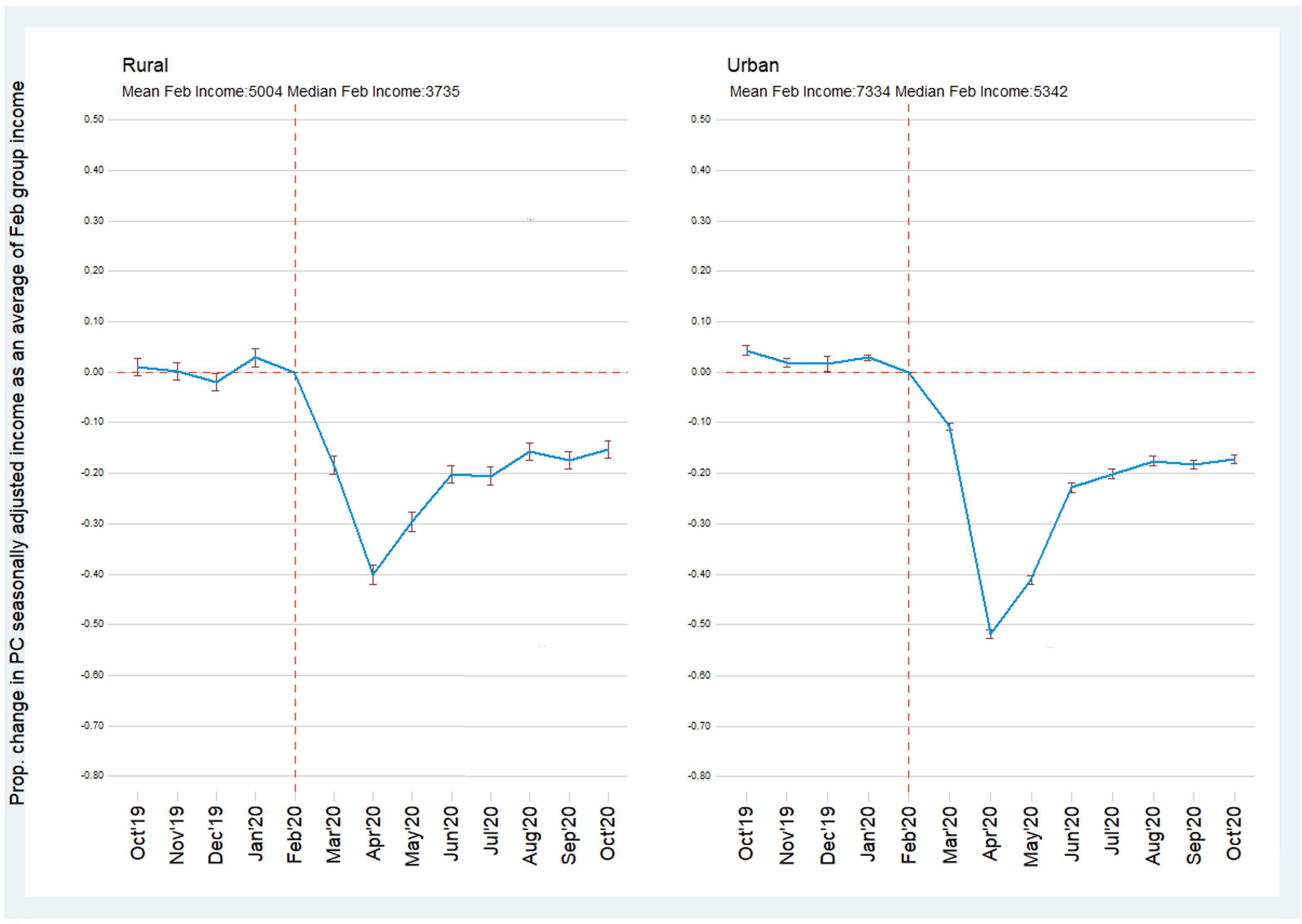 We find that the pandemic and the subsequent lockdown caused a 47% decline in the average seasonally adjusted per capita real household income in April 2020 relative to February 2020 (42% in rural, and 53% in urban areas) (Figure 2).