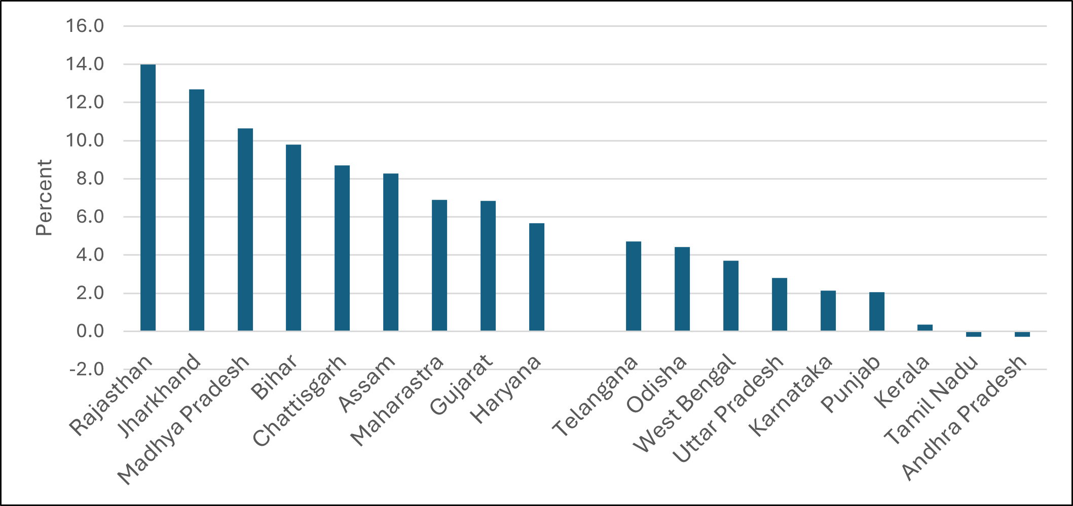 The growth rate in manufacturing employment in different states in recent years differed significantly (Figure 1). Some states recorded a growth rate of about 10% per annum or above (Rajasthan, Jharkhand, Madhya Pradesh, and Bihar), whereas some other states recorded negligible growth in manufacturing employment or even a fall (for example, Tamil Nadu). The inter-state pattern of manufacturing employment growth is positively correlated with the increase in rural female workforce participation rate (RFWPR) (Figure 2).2  This is expected because of the significant rise in RFWPR between 2017-18 and 2023-24, resulting in an increase in rural female workers by about 80 million, 9% of whom took up manufacturing sector jobs (Goldar and Aggarwal 2024).