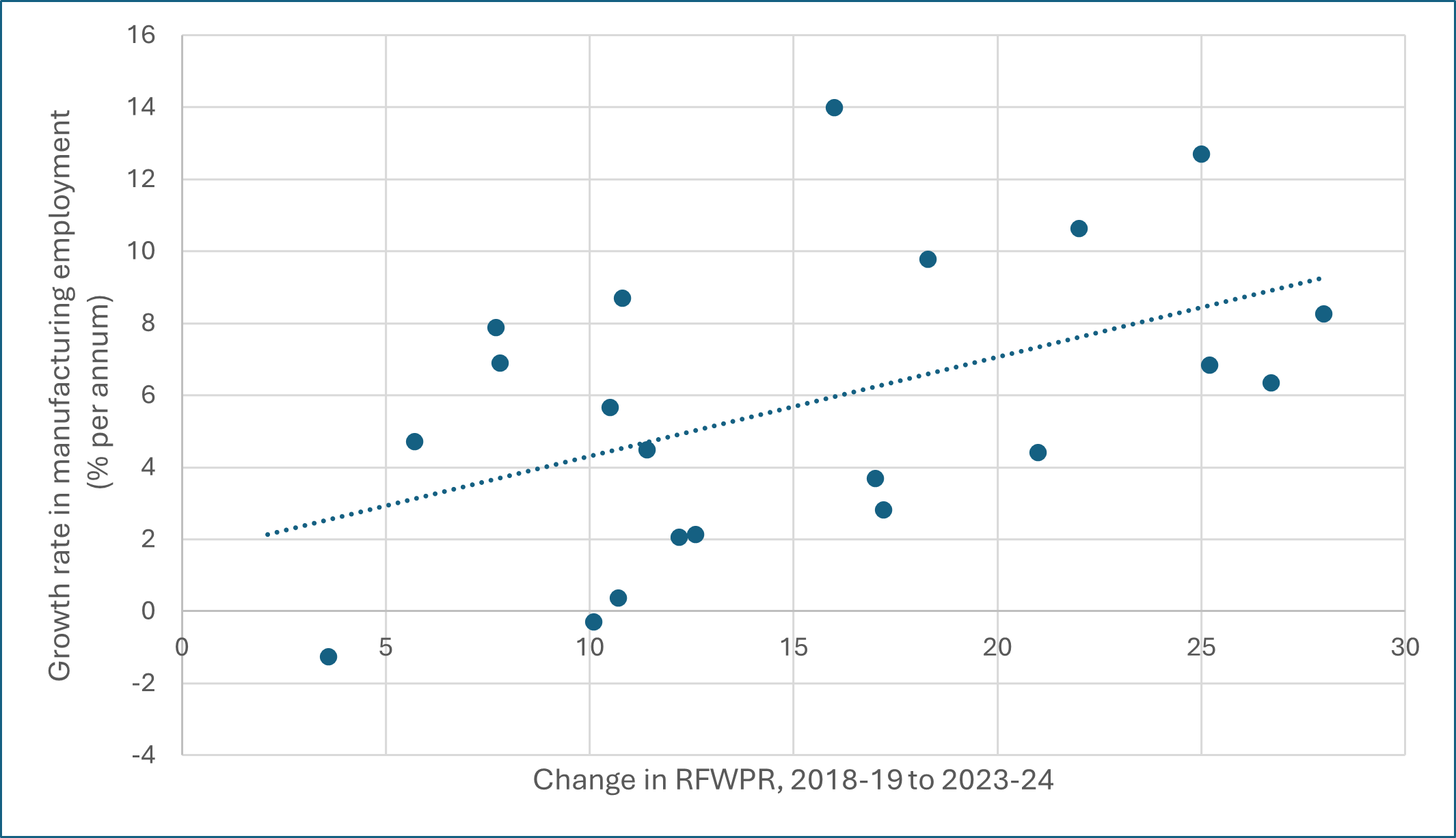 Figure 2. Change in RFWPR and growth rate in manufacturing employment