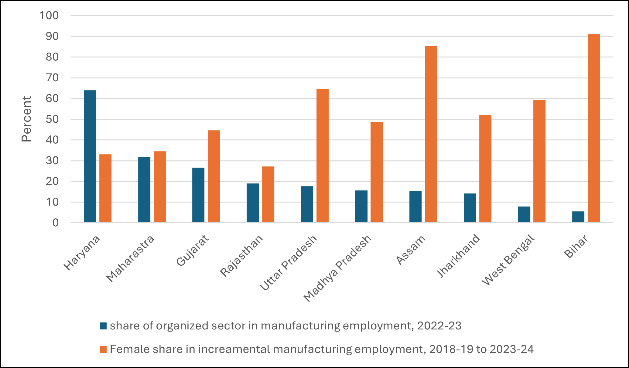 The share of females in incremental manufacturing employment differed among states (Figure 3). Gujarat, Maharashtra and Rajasthan accounted for about 45% of the increase in aggregate manufacturing employment between 2018-19 and 2023-24. The female share in incremental manufacturing employment in these states was relatively small (an average of about 36%). On the other hand, the female share in incremental manufacturing employment was about 90% in Bihar and 85% in Assam. In several states, the increase in female employment in manufacturing exceeded that in total employment because the number of male manufacturing workers declined. In Kerala, for example, total employment in manufacturing increased by 30,000 between 2018-19 and 2023-24, whereas female employment increased by 65,000. Such a pattern was also found in Karnataka and Andhra Pradesh. Evidently, the feminisation of industrial labour in India was geographically segmented.