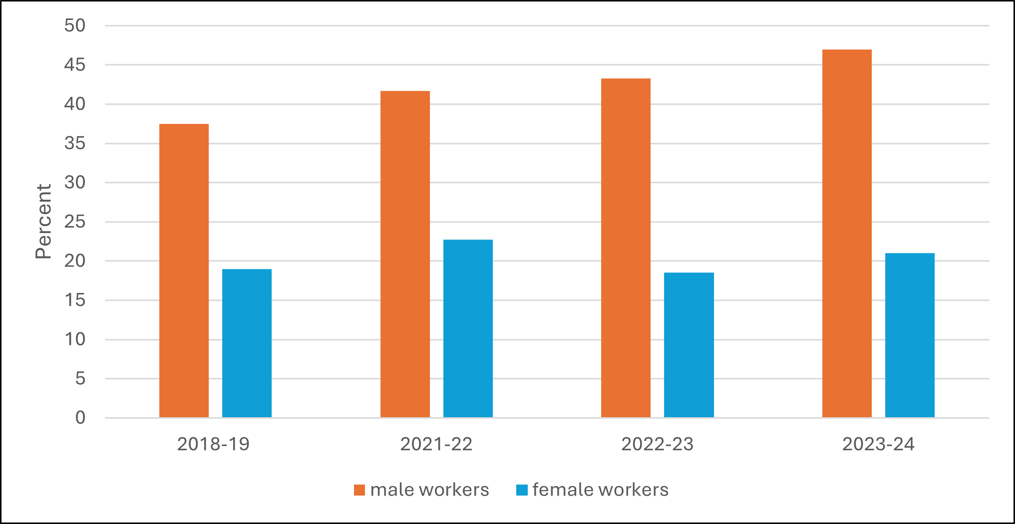 A deeper analysis reveals that the states in which organised or formal manufacturing has a relatively high share (for example, Haryana) did not experience any significant feminisation of industrial labour (Figure 4). On the other hand, the states in which the share of the formal sector in manufacturing employment is low (such as Assam, Jharkhand, West Bengal and Bihar) there was significant feminisation of industrial labour. The negative correlation between the share of the formal segment in manufacturing employment in 2022-23 and the share of females in incremental manufacturing employment between 2018-19 and 2023-24 is attributable mostly to the fact that the feminisation of the industrial workforce in recent years has taken place in the informal sector of manufacturing but not in the formal sector. The relative share of male workers in manufacturing enterprises having ten workers or more increased from 37.5% to 47% between 2018-19 and 2023-24 (Figure 5), whereas the corresponding share for female workers has remained at about 20% (further, Annual Survey of Industries (ASI), which covers organised manufacturing, shows that the share of females among total workers employed directly has not increased).