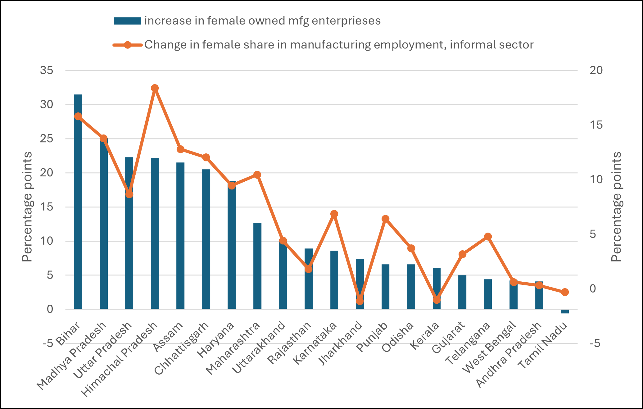 Figure 6. Increase in the proportion of female-owned manufacturing enterprises and female share in informal manufacturing employment, by state (2015-16 to 2022-23)
