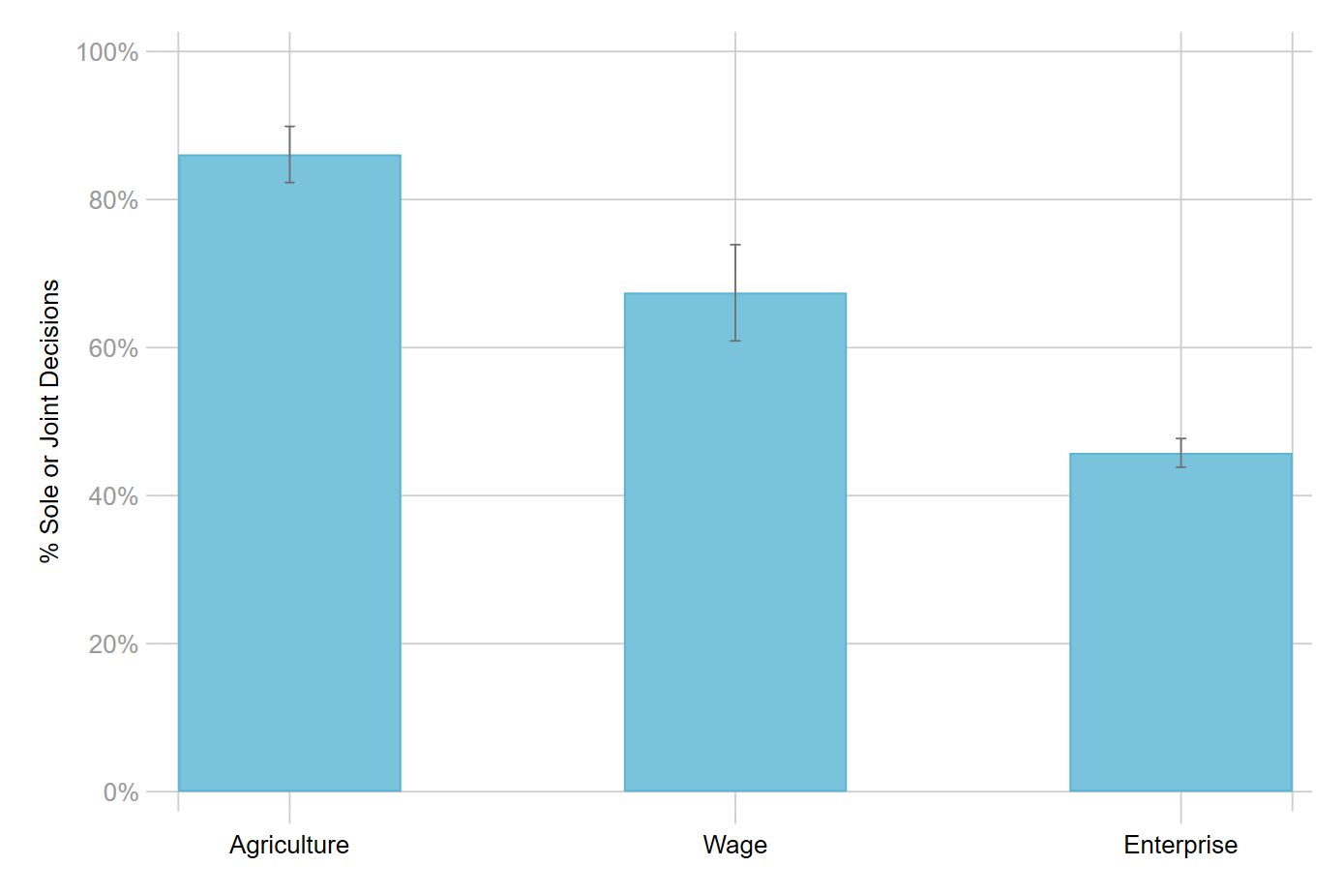 Note: The bars represent the percentage of women in our analysis sample who make cultivation, wage participation, and enterprise related decisions either solely or jointly.