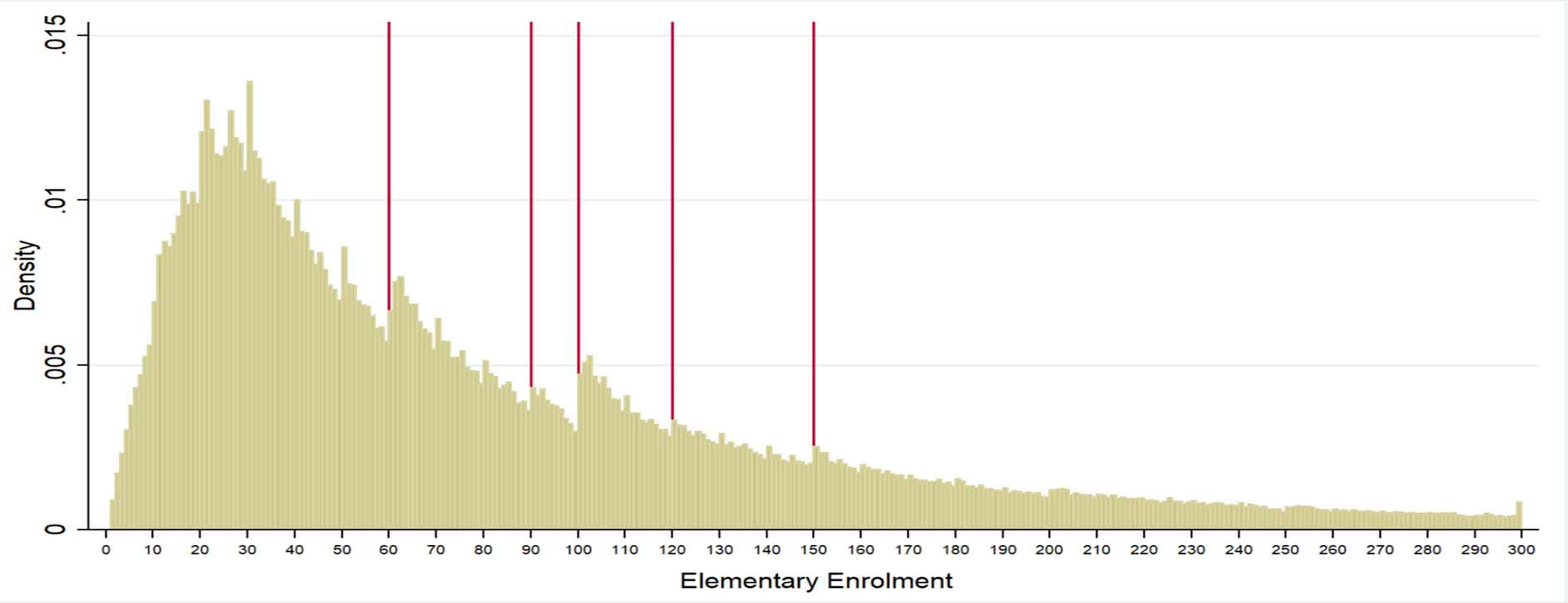 टिप्पणियाँ: (i) हिस्टोग्राम स्कूल के आकार (अर्थात कुल छात्र-नामांकन द्वारा) के अनुसार सभी सार्वजनिक प्राथमिक विद्यालयों के वितरण को दर्शाता है। (ii) यह दर्शाता है कि कई स्कूल कुछ वांछनीय सख्या में छात्र-नामांकन की रिपोर्ट करते हैं-जिसमें कुल छात्र-नामांकन में 20, 25, 30, 40, 50 आदि की अचानक वृद्धि होती है। (iii) 57, 58, 59 और 60 के छात्र-नामांकन ट्रफ (द्रोणी) को 61, 62 और आगे इसी प्रकार से स्पाइक्स द्वारा बनाया गया है,जो संभवतः इसलिए है कि, शिक्षक आवंटन मानदंडों के अनुसार, एक स्कूल को कुल 60 छात्र-नामांकन तक दो शिक्षक मिलते हैं, लेकिन 61 से 90 के कुल छात्र-नामांकन वाले स्कूल को तीन शिक्षक मिलते हैं। (iv) 100 से अधिक छात्र-नामांकन हो तो जूनियर स्कूल को एक प्रमुख-शिक्षक (हेड-टीचर) मिलता है,जिसके चलते 100 से अधिक छात्र-नामांकन दर्शाने वाले स्कूलों की संख्या में अचानक वृद्धि होने की संभावना है।