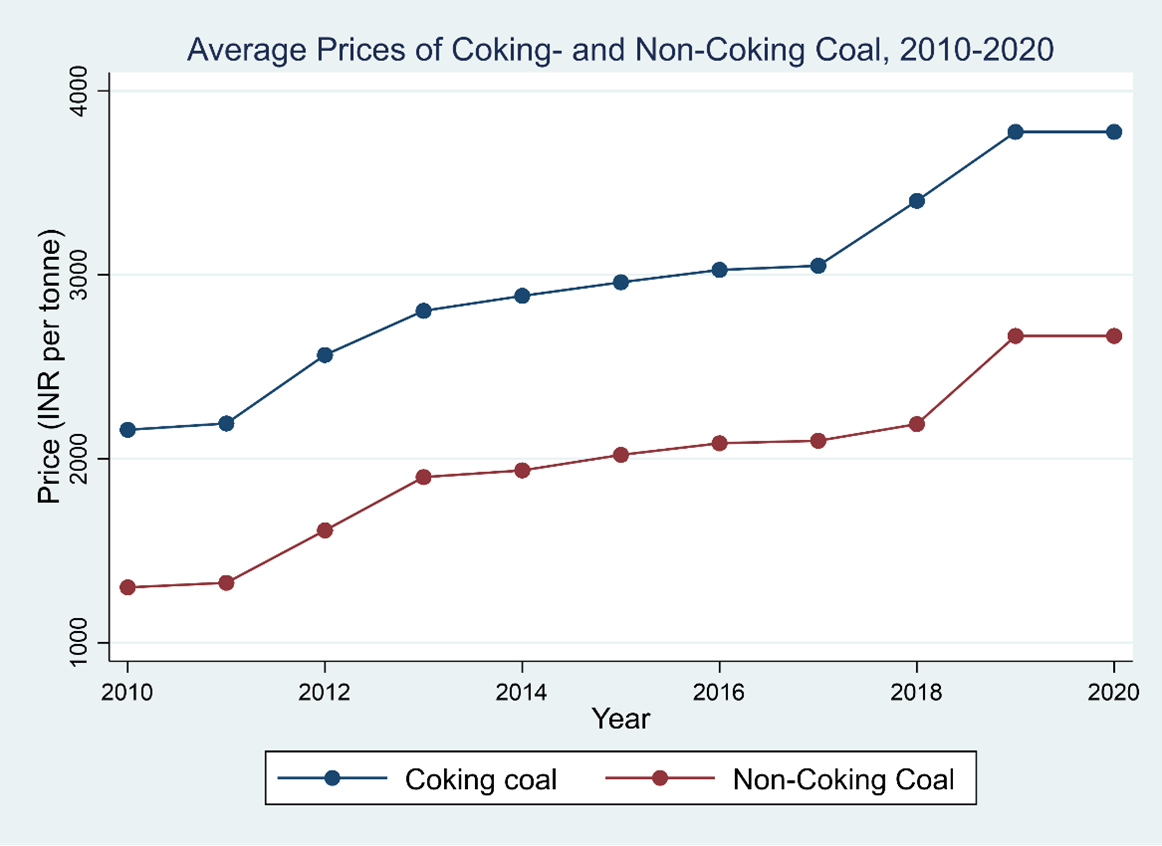 To measure the elasticity of substitution between labour and energy, I utilise external variation in coal and electricity prices over the 2009-10 to 2019-20 period. I combine annual data on energy prices from the annual Coal Directories and Ministry of Power with firm-level panel data from the Annual Survey of Industries (ASI) for the corresponding period. The analysis relies on three sources of geographical variation in energy prices. First, the mining cost of coal is drawn from “pithead” price set by Coal India Limited (CIL) for coking and non-coking coal. The government-owned CIL is India’s largest coal producer, mining over 80% of raw coal in the country, and remains a profitable company (Tongia et al. 2020). While coking coal is used directly in the blast furnace for steel production, non-coking coal is used for captive power generation by firms and in several other sectors (Ministry of Coal, 2021).